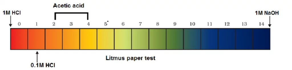 Acetic acid is a weak acid. Its PH range is 2 to 4. A typical,1M solution of acetic acid has a PH of 2.4. So on litmus paper, it shows a red-yellow colour. See activity 2.11.